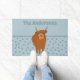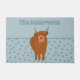 Create a personalised touch for your entryway when you add a name to this welcome mat. It features a cute illustration of a Scottish Highland Cow with its tongue out set against a pale blue polka dot background. Your name or other text appears above the graphic in coordinating blue lettering.