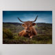 A beautiful poster from a photograph of a Scottish Highland cow relaxing in the pasture against a blue sky in the background. Great gift for farmers, ranchers, and anyone who loves animals or cattle. Scottish Highland cattle have long horns and long wavy coats of fur.