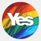 Round sticker with a rainbow / pride flag and the word 'yes' - show your support for a Yes vote in the Scottish Independence Referendum!