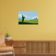 A graphic poster featuring an illustration of a Scottish landscape with a silhouetted man in a kilt playing bagpipes, standing on a hill in the middle of a green field. The background contains a castle and trees and few clouds in the sky. This wall art will be perfect for home or office decoration.