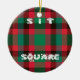 The image features a traditional tartan plaid pattern, a hallmark of Scottish textiles. Superimposed on this rich fabric are the words "SIT" and "SQUARE," arranged vertically. The word "SQUARE" incorporates small cartoonish figures embedded within the letters, adding a whimsical touch. The composition is balanced and focused, emphasizing both the tartan design and the text.