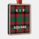 The image features a traditional tartan plaid pattern, a hallmark of Scottish textiles. Superimposed on this rich fabric are the words "SIT" and "SQUARE," arranged vertically. The word "SQUARE" incorporates small cartoonish figures embedded within the letters, adding a whimsical touch. The composition is balanced and focused, emphasizing both the tartan design and the text.