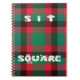 The image features a traditional tartan plaid pattern, a hallmark of Scottish textiles. Superimposed on this rich fabric are the words "SIT" and "SQUARE," arranged vertically. The word "SQUARE" incorporates small cartoonish figures embedded within the letters, adding a whimsical touch. The composition is balanced and focused, emphasizing both the tartan design and the text.