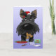 Scottish Terrier trying to get away with eating all of Santa's cookies. Scottie is wearing a Santa Hat, with ginger bread man in his mouth and inside of card reads, "Ho... Ho... Ho???"