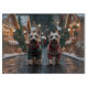 This festive design captures the joyful spirit of the holiday season, featuring an adorable dogs.Nestled in a winter wonderland, complete with a decorated Christmas tree, and beautifully wrapped presents. Snowflakes gently fall, adding a magical touch to the scene, while the vibrant colours of the holiday decorations create a warm and cheerful atmosphere.
