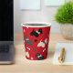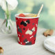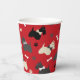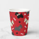 Cute black, grey and wheaten Scottie dogs wearing bows, with pawprints and dog bones on a red background.