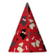 Cute black, grey and wheaten Scottie dogs wearing bows, with pawprints and dog bones on a red background.