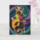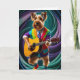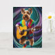 A Scottish Terrier in a colourful suit is playing acoustic guitar.
