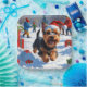 A cheerful Scottish Terrier runs happily through the snowy winter scene, wearing a festive red Christmas hat. This charming design highlights the breed’s distinctive silhouette, wiry coat, and spirited personality while capturing the warmth and joy of the holiday season. A delightful winter moment full of festive cheer.
