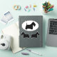 Oval and die cut sticker set. These durable dog silhouette decals are waterproof and scratch resistant. Stick these Scottish Terrier silhouette vinyl stickers to your laptop, phone, notebook, water bottle, helmet, skateboard, or even your car. Visit Jenn’s Doodle World for even more dog breed vinyl decals and Scottie Dog lover’s gifts.