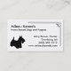 A simple black and white design featuring a silhouette of a Scottish Terrier with a geometric pattern border in the corner.