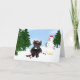 Unique Scottish Terrier winter wonderland design. Scottish Terrier with a bit of snow on his nose. Irritated snowman looks on. To ward off the cold the Scottish Terrier has on a scarf and hat that are the colours of his country.