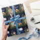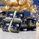 Have a little boy camper who is a scout? This adorable woodland themed gift wrap has a little a racoon in jeans and a red baseball cap roasting marshmallows with a squirrel in a striped shirt and a little boy in his scout uniform. The wildlife sits around a campfire in the woods with pine trees, dark blue sky, clouds and moon.