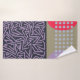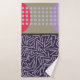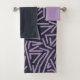 This towel set has a lavender washcloth, a navy hand towel, and a bath towel with a mid-century modern abstract design with three different backgrounds, zigzag lines, ovals, and circles, in navy, light blue, red, khaki, and lavender. If you want the same design with different colours, message me.
