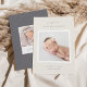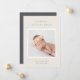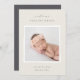 Elegant birth announcement in soft colours features a square newborn photo framed in white, with "welcome [Name]" at the top in chic grey lettering. Personalise with baby's birthdate, and birth stats beneath, and add a personal message to the back, along with an additional photo.