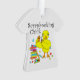 Scrapbooking chick in curly text and a cute yellow chick with paper, books, scissors and glue is a fun gift design for croppers at birthdays and holidays.