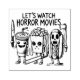 A terrified popcorn bucket, shrieking soda cup, and skull-faced hot dog burst into frame, mid-panic, as if fleeing a cinematic nightmare. Their exaggerated expressions and cartoon limbs channel classic horror tropes with a playful twist. Surrounded by bats and bold lettering that cries “LET’S WATCH HORROR MOVIES,” the scene captures the delicious dread of movie night gone spooky—equal parts fright and fun.