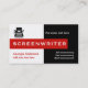 Screenwriter black, white, red eye-catching business card featuring a typewriter in black on white, black background and a red band with the text Screenwriter.