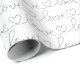 Whimsical yet modern wrapping paper in chic black and white features a repeat pattern of "love" in handwritten style monoline script typography joined by hearts. A unique choice for wedding gifts and Valentine's Day treats!