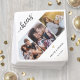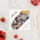 Cheers! Add an elegant personalised touch to wedding reception decorations with custom 3 photo collage paper napkins. All pictures and text on this template are simple to customise for a wedding, engagement party, couple's bridal shower, anniversary or other occasion. The names can be personalised as monogrammed initials or other wording of your choice. The unique diagonally rotated design features a faux foil heart, modern trendy handwritten script calligraphy, minimalist classic typography and three favourite photos. Please note that gold is printed colour, not metallic foil. These stylish cocktail napkins add a chic customised touch to a special day celebration. Congratulations to the bride and groom!