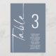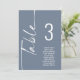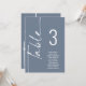 Script Dusty Blue Table Number Names Seating Chart. Edit you number for each table and add to your cart separately. Same design is on both sides, use for a hanging display so guests can find their seat or on each table. In light blue with white writing. Easily personalise the table number and your guest names. The same design is on both sides and will update simultaneously as you change the words to your own.