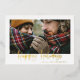 Gold effect stylish script happy holidays with coordinating mustard and black check tartan backer design. Space for a single photo design.
