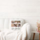 Pillow featuring the words "Our Family" in a stylish script with 4 photos photos arranged side by side on the front and back side making it 8 photos in total that you can replace with you own photos against a white background. You can also add your family name and the year established. Perfect for home decor, newlyweds, family keepsakes, etc.