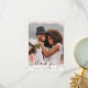 Elegant wedding thank you card featuring "thank you" in a chic script with swashes overlaying your wedding day photo and your first names and wedding date joined with a heart. On the back, personalise your thank you message and add your names in a signature-like script on a light cream background.
