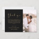 Show your appreciation with timeless elegance using this Black and Gold Script Photo Wedding Thank You Card. Featuring a bold black background, shimmering gold script, and space for a cherished wedding photo, this design brings a luxurious touch to your post-wedding stationery. Perfect for formal, black-tie, or glam wedding themes, it allows you to personalise with your names and message for a meaningful and sophisticated thank-you card your guests will love.