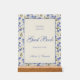 Sweet pea themed floral guest book sign with script font in blue with a floral frame made of blue sweet pea floral print on cream background
