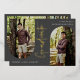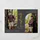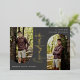 Graduate. Modern edgy script, in silver foil. Graduation announcement/invitation. 2 arch frame photos on front, single photo on back with dark grey background colours.