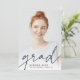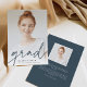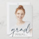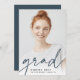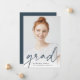 Modern graduation announcement for your class of 2022 grad features a single vertical/portrait orientated photo, with "grad" along the bottom in dark dusty blue handwritten script lettering. The graduate's name and school appear along the bottom. Add a personal announcement to the back, along with an additional photo.