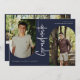 Modern scripted "graduate", arch frame 4 photo graduation announcement/invitation in classic navy blue.