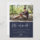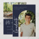 Modern scripted "graduate", arch frame photo graduation announcement/invitation. Features, white typography on navy blue backgrounds.