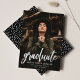 Simple graduation announcement featuring the graduate's photo with "graduate" in real silver foil script. Personalise the front of the photo graduation announcement by adding the graduate's name, school name, and graduation year. The announcement reverses to display a pattern of white sprinkles with a black background or colour of your choice.