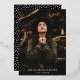 Simple graduation thank you card featuring the graduate's photo with "graduate" in real silver foil script. Personalize the front of the photo graduation thank you card by adding the graduate's name, school name, and graduation year. The thank you card reverses to display your message with a pattern of white sprinkles with a black background or color of your choice.