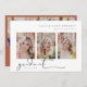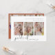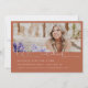 Signature script, 4 photo snapshot, graduation announcement. Features, 3 vertical portrait photos on front, single vertical photo on back, celebration party invitation and solid rust orange colour backing.