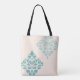 Scroll and leaf damask repeat design in light and mid-teal detail on a cream colour background.