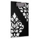 Scroll and leaf damask with white detail on a black background in a modern style print.
