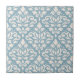 Scroll and leaf damask in a vintage style large pattern, with cream detail on a blue background.