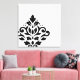 Scroll and leaf damask off-set (bottom left) design in black detail on a white background in a modern style art print.
