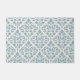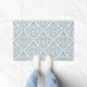 Scroll and leaf damask in a surface pattern design with blue detail on a cream colour background.