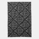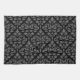 Scroll and leaf damask in a vintage style pattern, with gray detail on a black background.