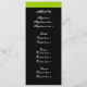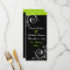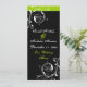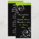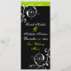 Elegant floral scroll leaf black, green flourish wedding menu card, featuring white scroll leafs, swirls, curls and lime green dots on black background. There is a green band on the top. This classy, stylish and chic design is part of a wedding set paper products and is perfect for a spring or winter wedding.