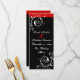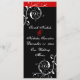 Elegant floral scroll leaf black, red flourish wedding menu card, featuring white scroll leafs, swirls and curls and red dots on black background. There is a red band with your text on the top. Classy, stylish and chic design perfect for a winter wedding.