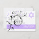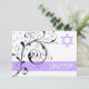 Elegant floral scroll leaf white, lavender purple flourish and Star of David Bat Mitzvah (בת מצוה) response/reply RSVP card, featuring black scroll leafs, swirls, curls and purple dots on white background. There is a purple band with the text RSVP to the bottom and lime green text on the back. Classy, modern, stylish and chic design perfect for your event. Change purple (background) to any colour!