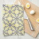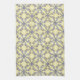 Dainty yellow kitchen towel with an ornate pattern in navy blue and white. Detailed and intricate leafy scrollwork design.