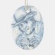 A blue and white pencil sketch of Ebenezer Scrooge in his hat and jacket.