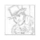 A blue and white pencil sketch of Ebenezer Scrooge in his hat and jacket.