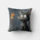 A curious, scruffy black cat gazes intently at a vibrant monarch butterfly against a backdrop of dark and muted colors of an alley